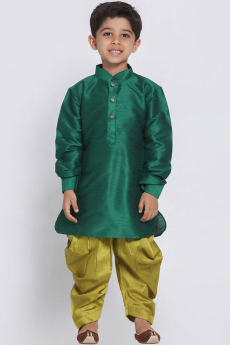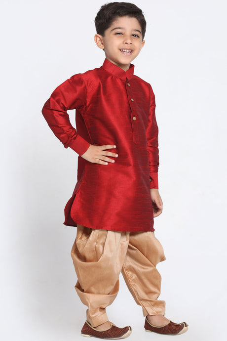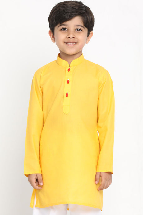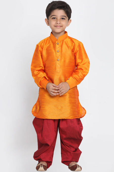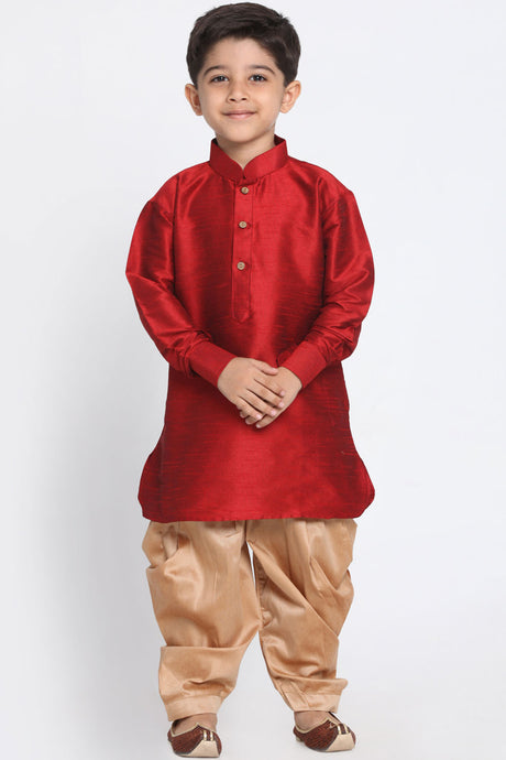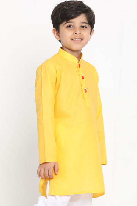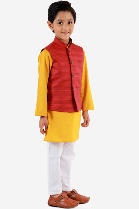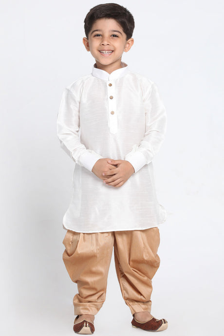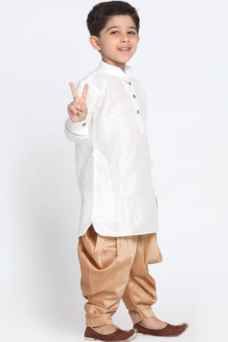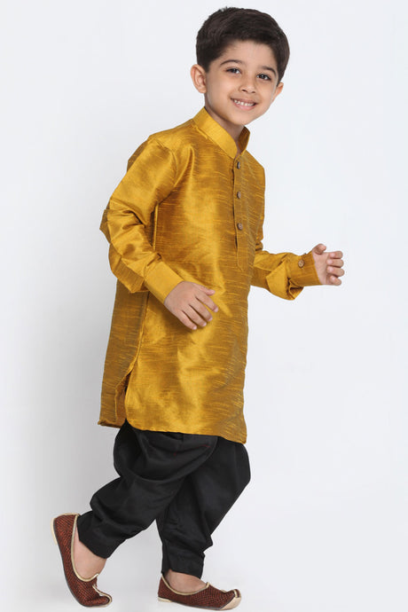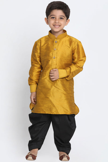 Boy's Cotton Art Silk Solid Kurta And Pajama Set In Gold