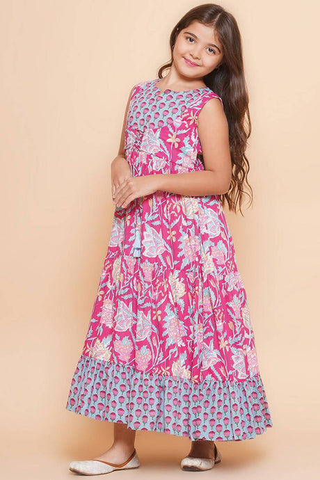 Girl's Pink Ethnic Motifs Foil Printed Cotton Kurta Set