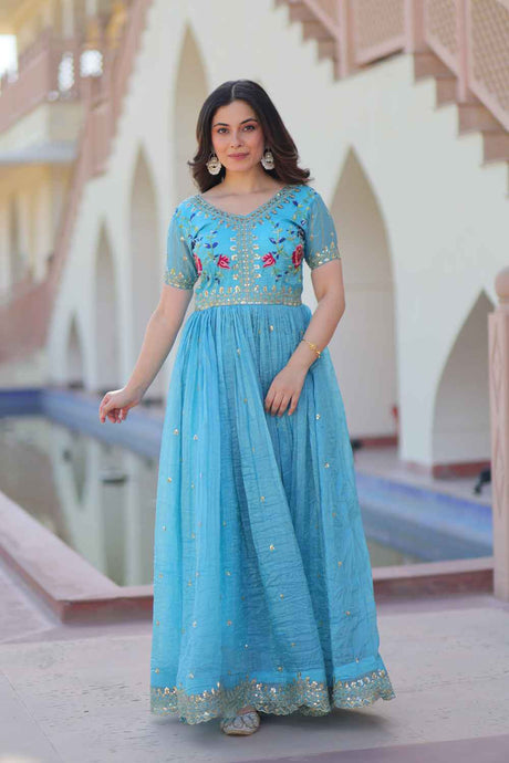 Blue Floral Embroidered Georgette Gown