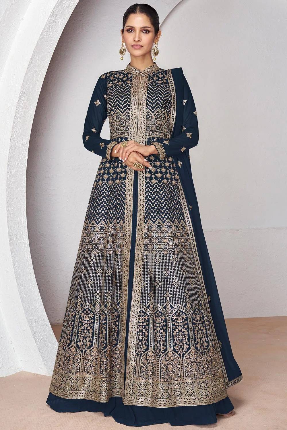 Navy Blue Sequin with Embroidered Georgette Gown