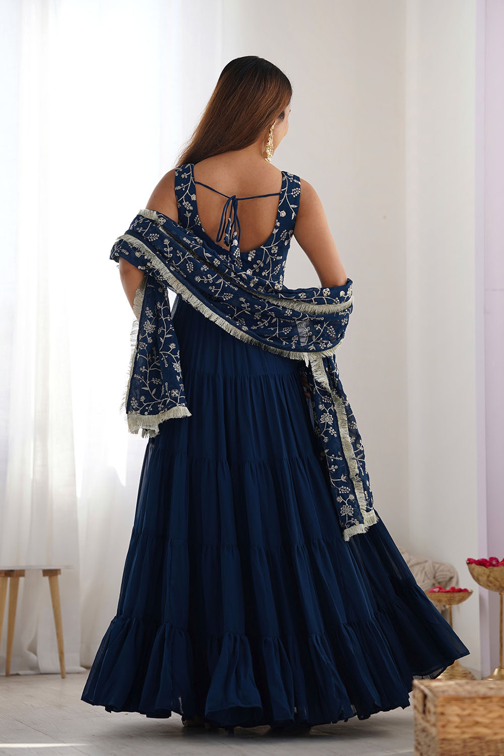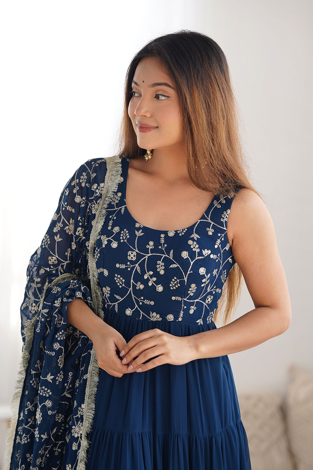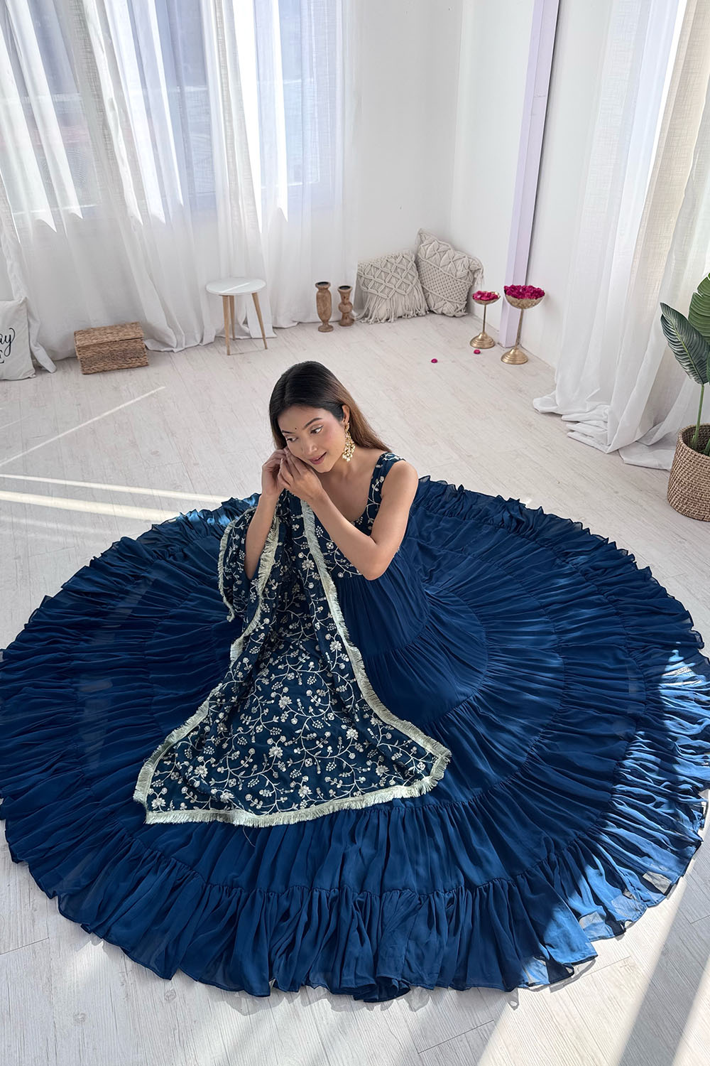 Step into effortless style with our Gown crafted for the modern woman who cherishes their Special occasion. Made from soft Georgette it keeps you comfortable all day long. The Embroidered design lends a touch of sophistication to your outfit. Perfect for Party wear this Gown is a must-have for versatile styling options. Style it with minimalistic accessories and flats for a casual look or jewelry and heels for special events