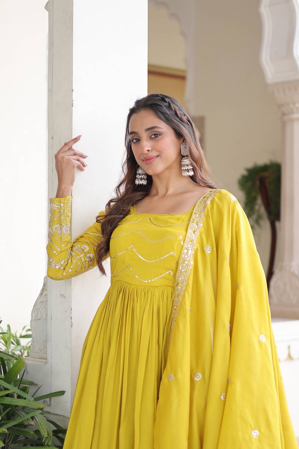 Step into effortless style with our Gown crafted for the modern woman who cherishes their Special occasion. Made from soft Silk it keeps you comfortable all day long. The Sequin design lends a touch of sophistication to your outfit. Perfect for Festive this Gown is a must-have for versatile styling options. Style it with minimalistic accessories and flats for a casual look or jewelry and heels for special events