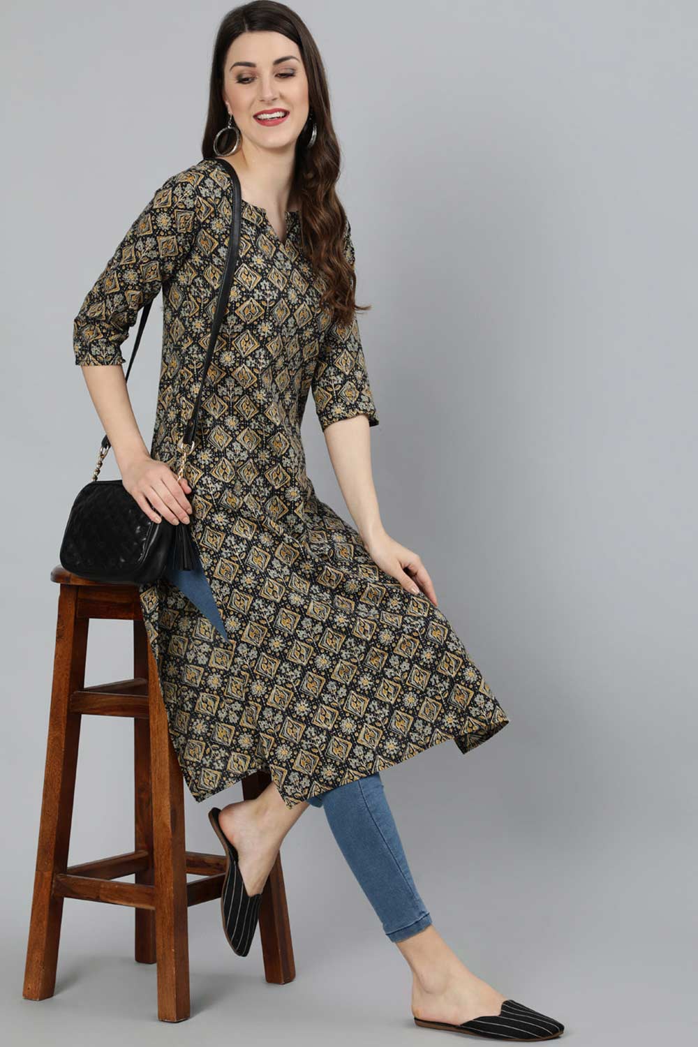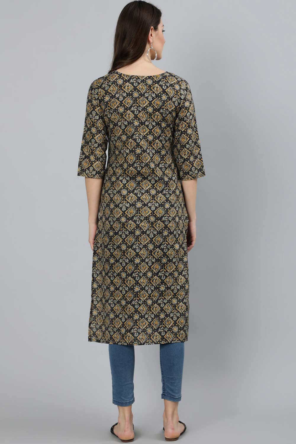 Black Cotton Geometric Abstract Printed Straight Kurti