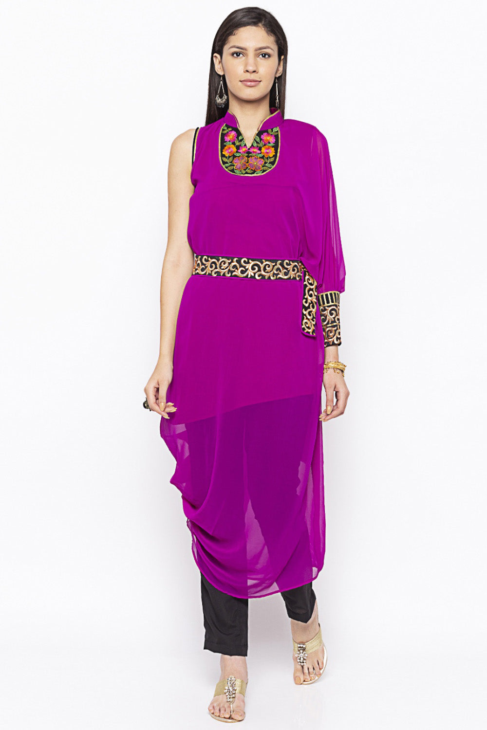 Magenta georgette cowed asymmetrical Kurti with 1 one side cuffed embroidered sleeves and neckline with separate embroidered belt having gold piping on neck and back keyhole neck