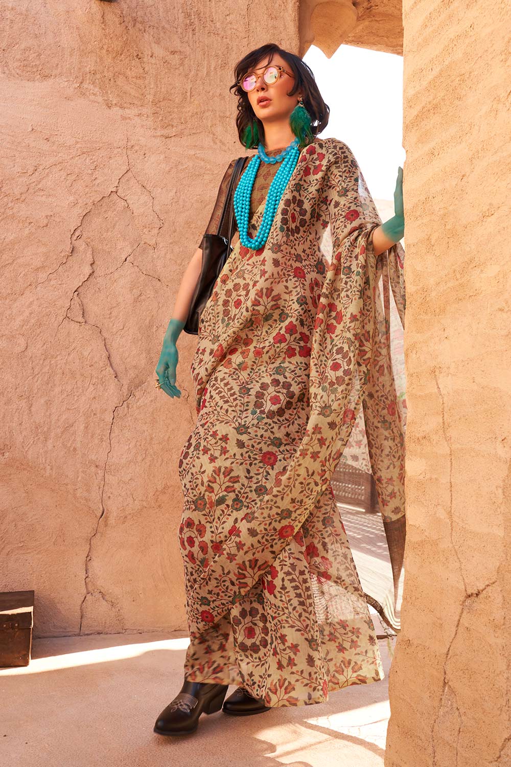 The saree is crafted from tissue fabric, known for its lightweight, airy texture and subtle sheen. The base color is beige.