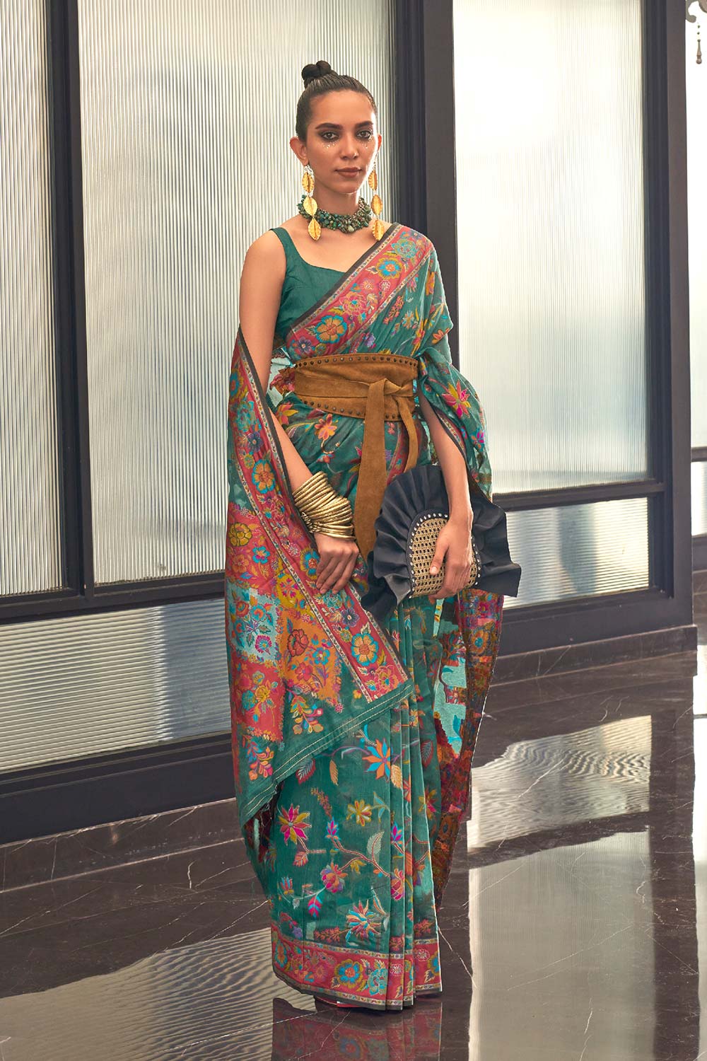 The Kabira Teal Modal Woven Saree combines the luxurious feel of modal with a striking teal hue and intricate woven details, making it a versatile and elegant choice for a variety of special occasions.