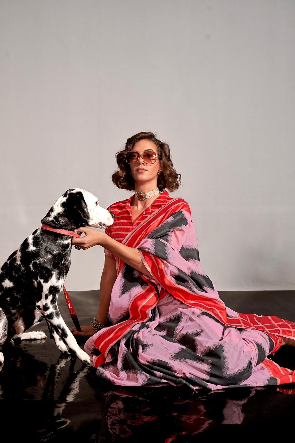 The saree is made from silk, known for its smooth, glossy surface and graceful drape. The color is lavender.