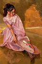 The saree is crafted from tissue fabric, renowned for its lightweight, airy texture and subtle shine. The base color is lavender.