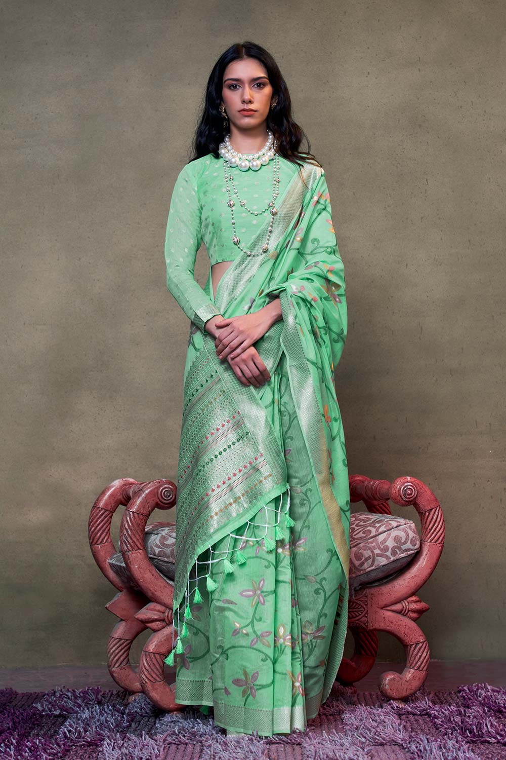Green Jamdani Woven Handloom Saree is a stunning and elegant garment that combines the rich tradition of Jamdani weaving with a vibrant green hue.