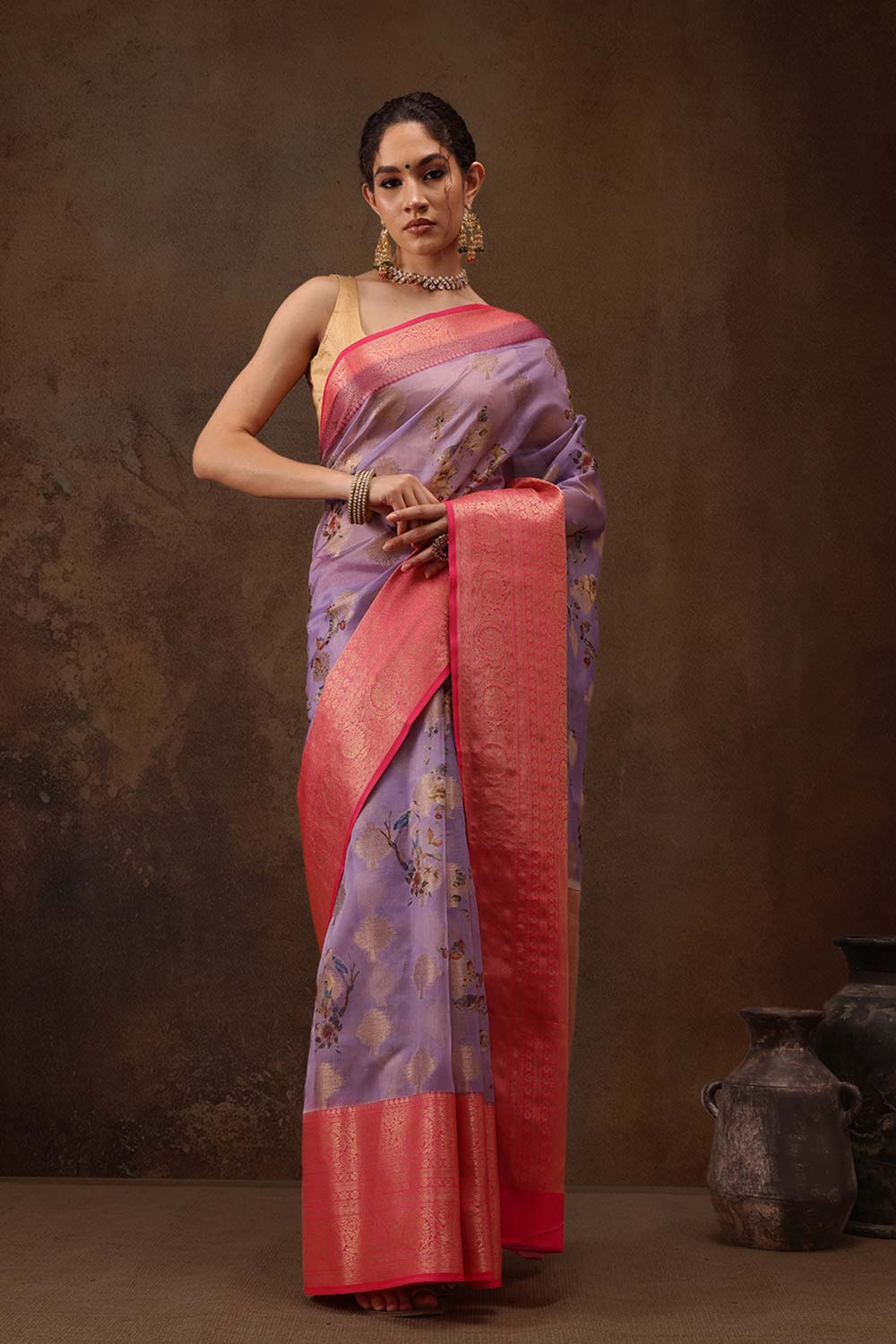 Lavender Floral Chanderi Kamlamkari Art Silk Saree