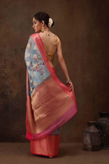 Blue Floral Chanderi Kamlamkari Art Silk Saree