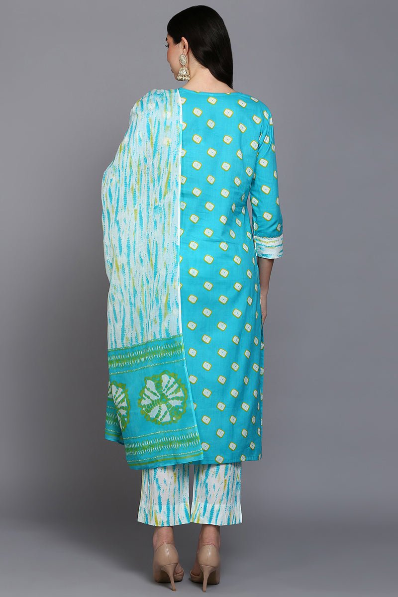 Cotton Blue Bandhani Printed Straight Kurti Pant With Dupatta