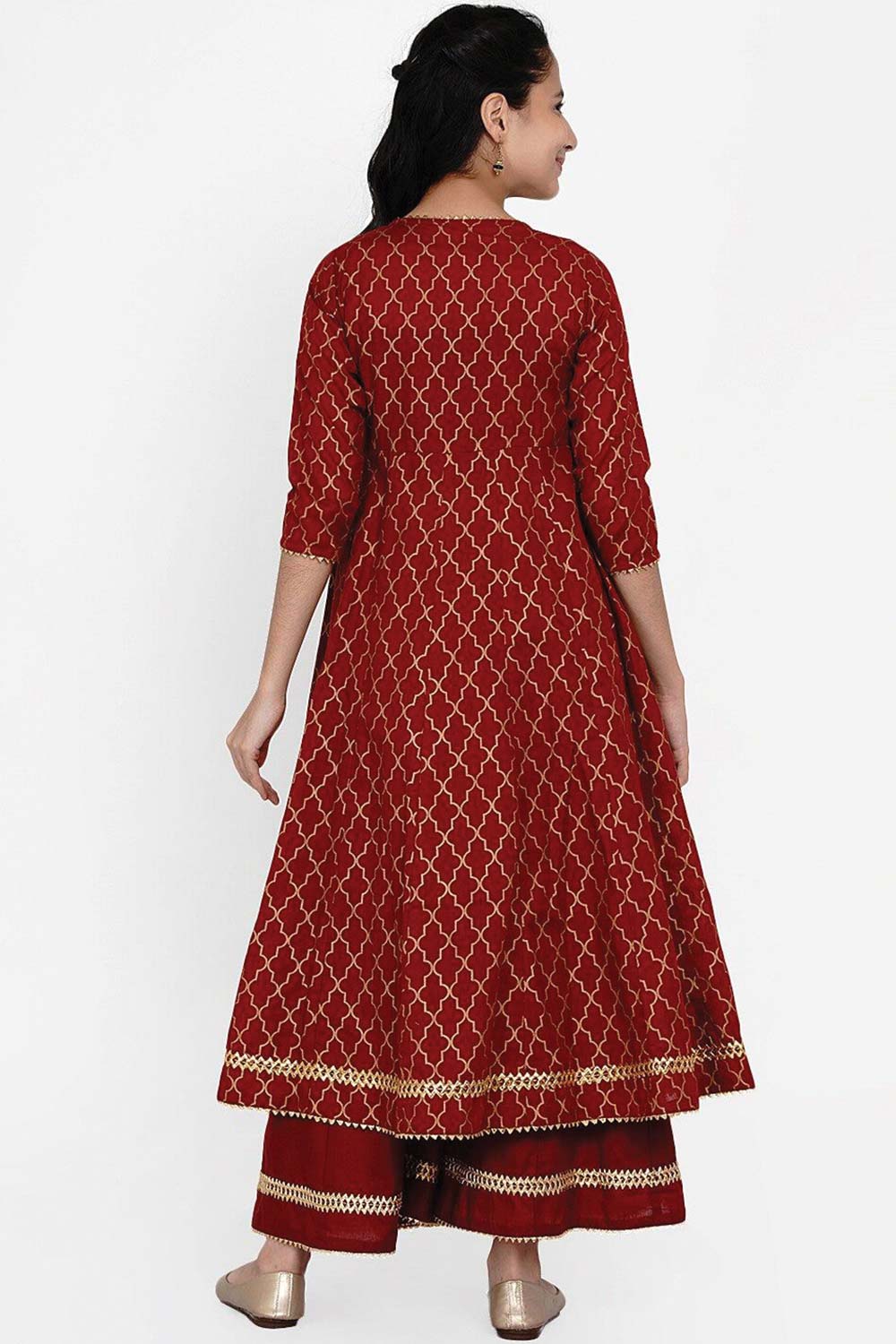 Girl's Maroon And Gold Ethnic Motifs Foil Print Anarkali Kurta With Palazzos