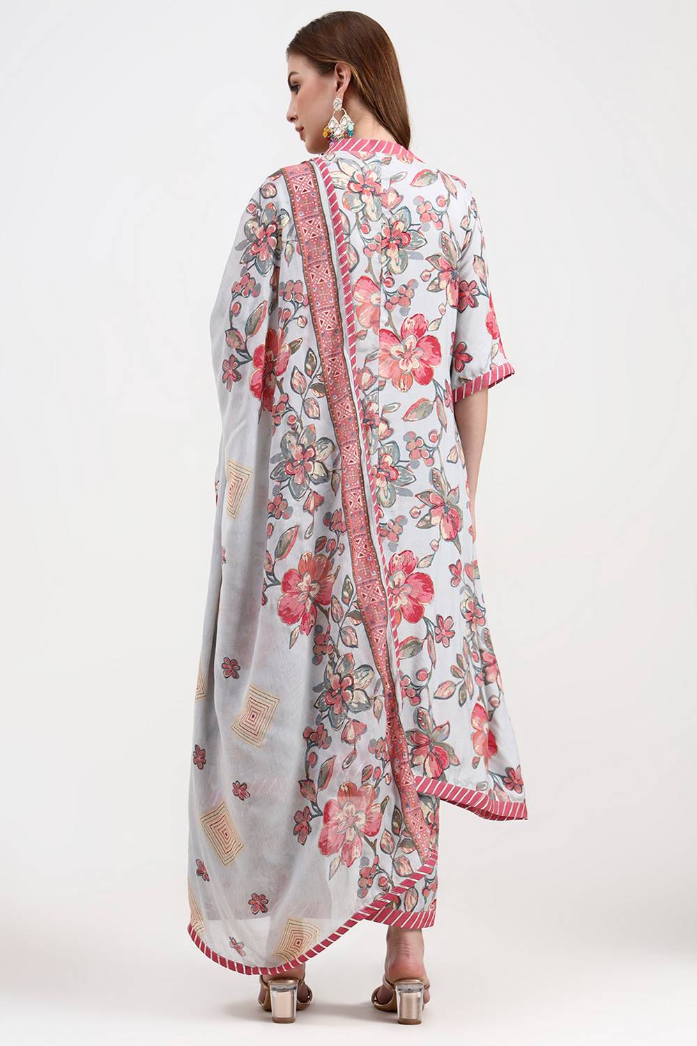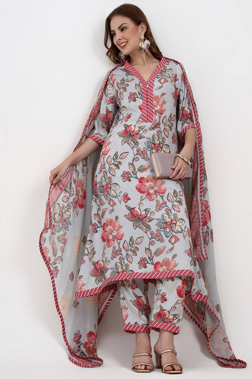 Multi Color Floral Printed Silk Straight Cut Suit Set