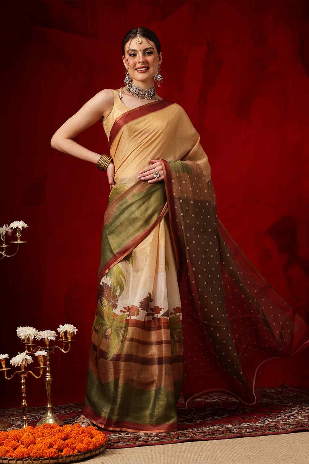 Elevate your wardrobe with our exquisite Ready to Wear Saree a masterpiece crafted to add timeless elegance to your style. Made from Cotton Blend this saree offers a perfect mix of comfort and sophistication. Adorned with Printed it showcases intricate craftsmanship that speaks volumes of tradition and artistry. Perfect for Festive this saree is a versatile addition to your collection, ensuring you stand out effortlessly. Pair it with elegant Jewelry, for a glamorous look. Add Clutches or Potli Bags and complete the ensemble with Wedges & Heels , making it a perfect choice for any event. Make a statement and embrace the elegance of Ready to Wear Saree today