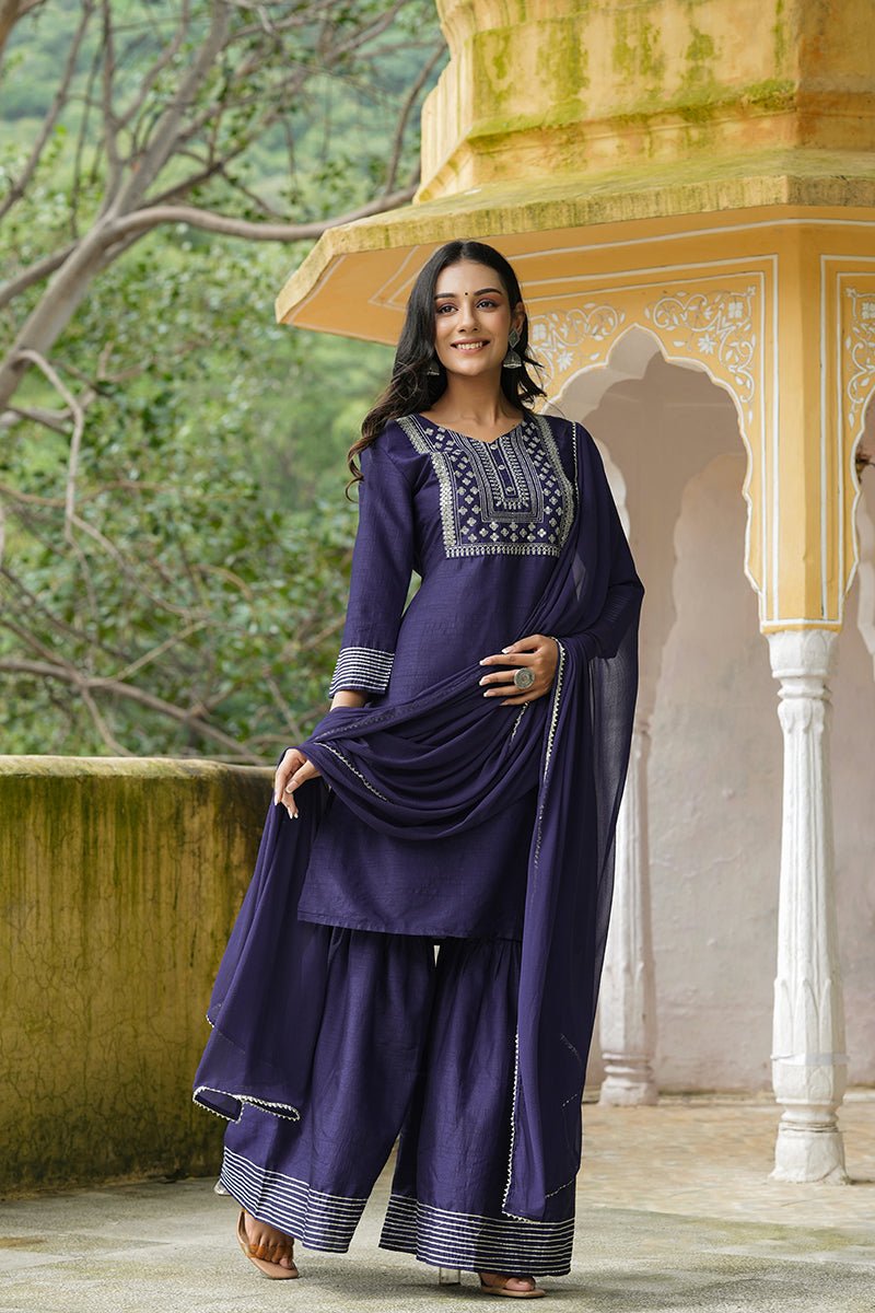 Navy Blue Poly Silk Straight Sharara Suit Set