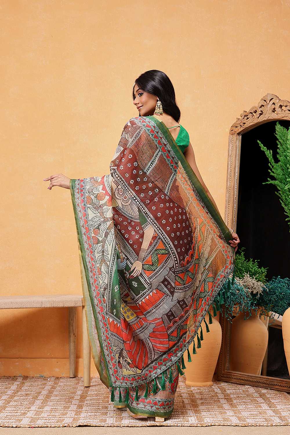 Elevate your wardrobe with our exquisite Ready to Wear Saree a masterpiece crafted to add timeless elegance to your style. Made from Cotton Blend this saree offers a perfect mix of comfort and sophistication. Adorned with Madhubani Printed it showcases intricate craftsmanship that speaks volumes of tradition and artistry. Perfect for Festive this saree is a versatile addition to your collection, ensuring you stand out effortlessly. Pair it with elegant Jewelry, for a glamorous look. Add Clutches or,potli Bags and complete the ensemble with Wedges & Heels making it a perfect choice for any event. Make a statement and embrace the elegance of Ready to Wear Saree today