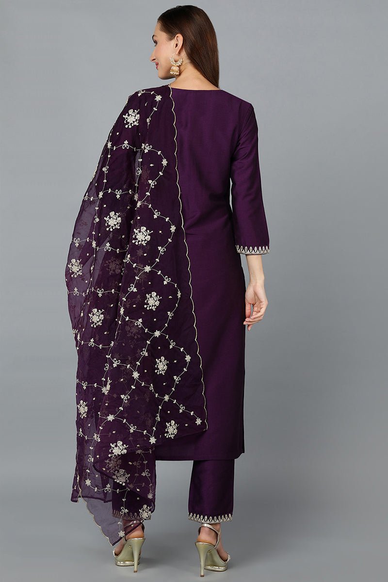 Purple Silk Blend Straight Kurti Pant With Dupatta