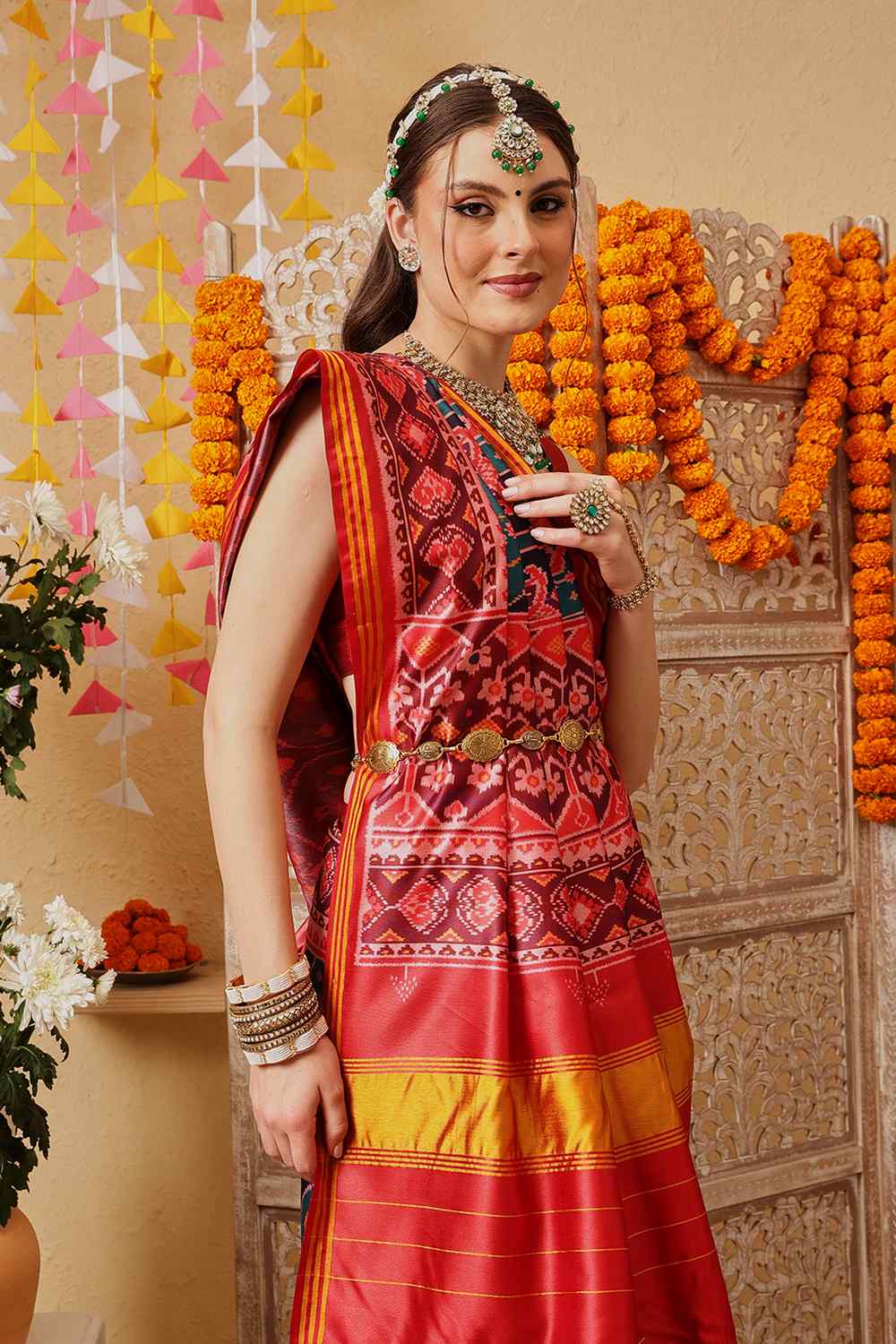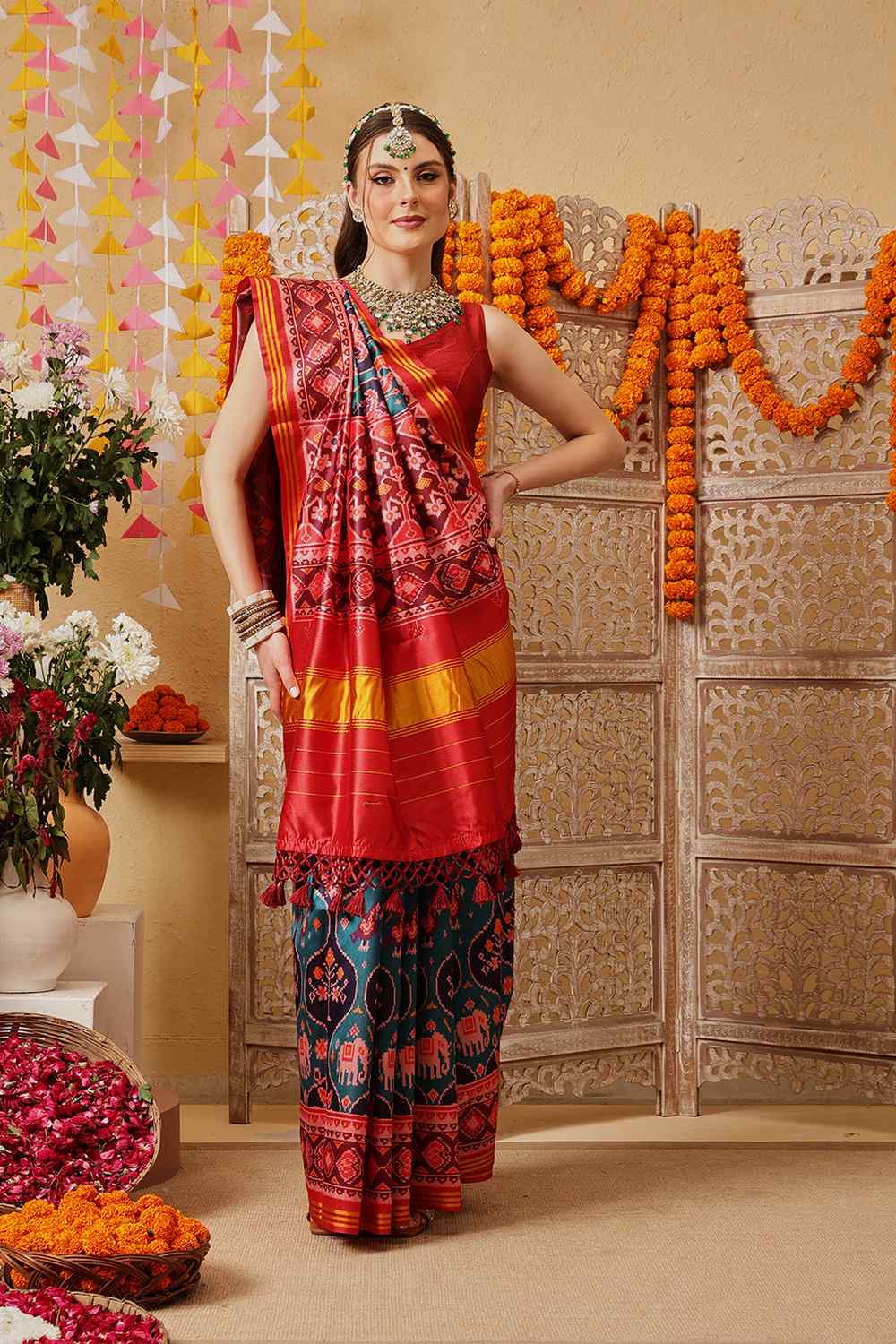 Elevate your wardrobe with our exquisite Saree a masterpiece crafted to add timeless elegance to your style. Made from Silk this saree offers a perfect mix of comfort and sophistication. Adorned with Printed it showcases intricate craftsmanship that speaks volumes of tradition and artistry. Perfect for Festive this saree is a versatile addition to your collection, ensuring you stand out effortlessly. Pair it with elegant Jewelry, for a glamorous look. Add Clutches or Potli Bags and complete the ensemble with Wedges & Heels , making it a perfect choice for any event. Make a statement and embrace the elegance of Saree today