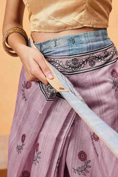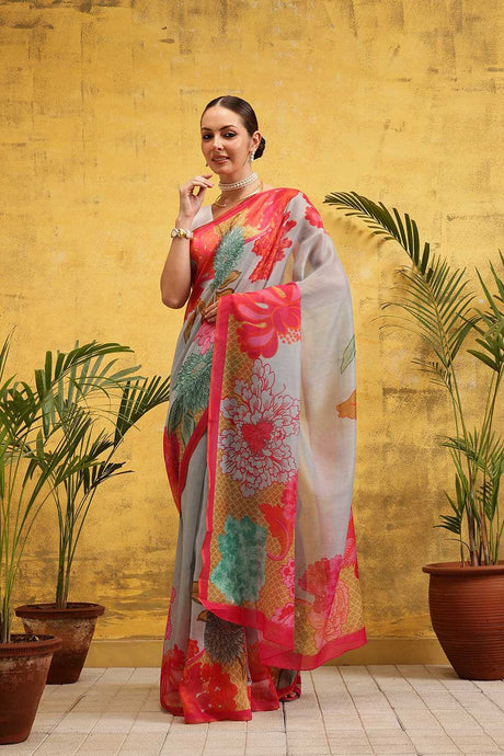 Grey Floral Printed Cotton Blend Ready to Wear Saree