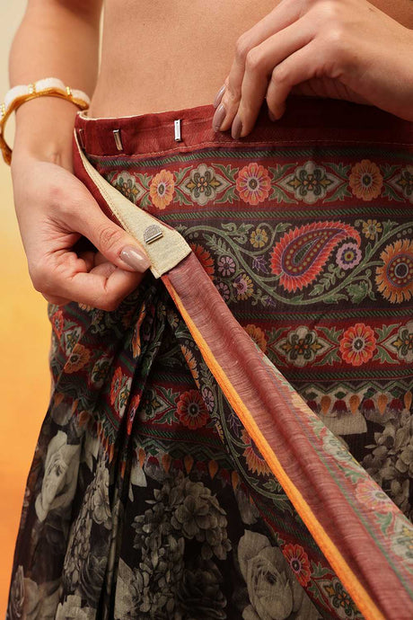 Black Floral Printed Cotton Blend Ready to Wear Saree