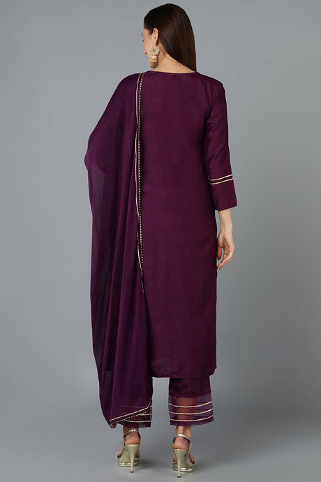Purple Silk Blend Embroidered Straight Kurti Pant With Dupatta