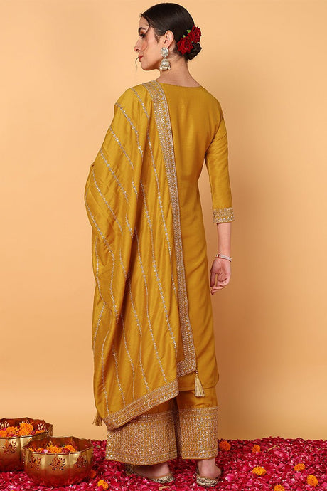 Mustard Silk Blend Solid Embroidered Straight Suit Set