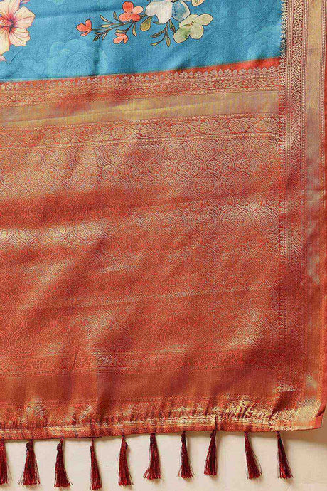 Turquoise Floral Printed Silk Saree