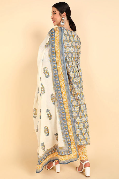 Yellow Cotton Flared Kurti Pant With Dupatta