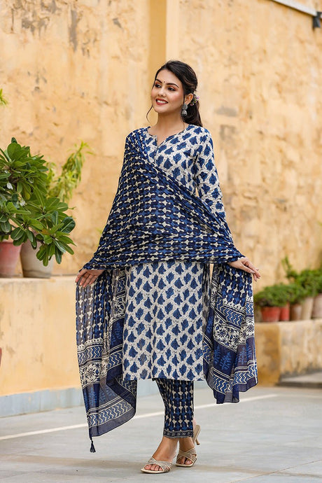 Navy Blue Chanderi Woven Design Straight Kurti Pant With Dupatta