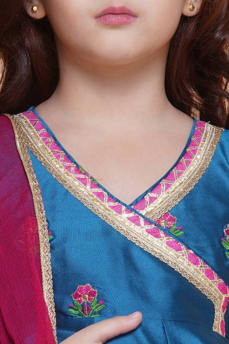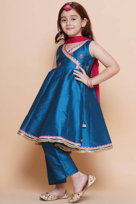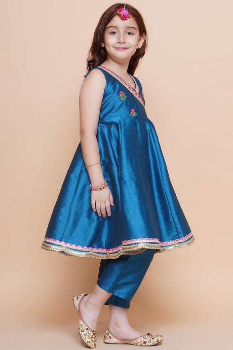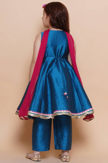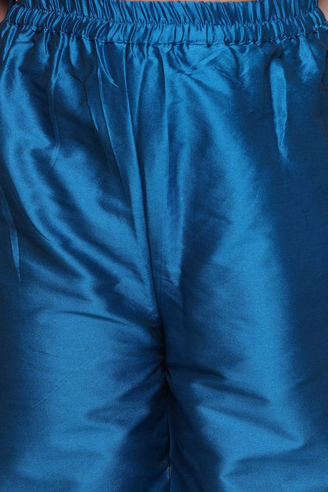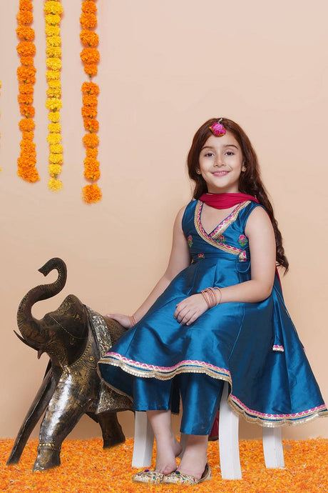 Girl's Blue Solid Silk Kurta Set