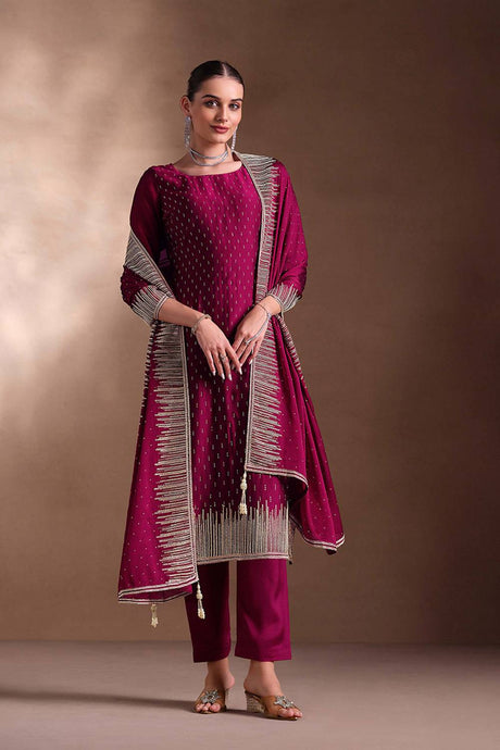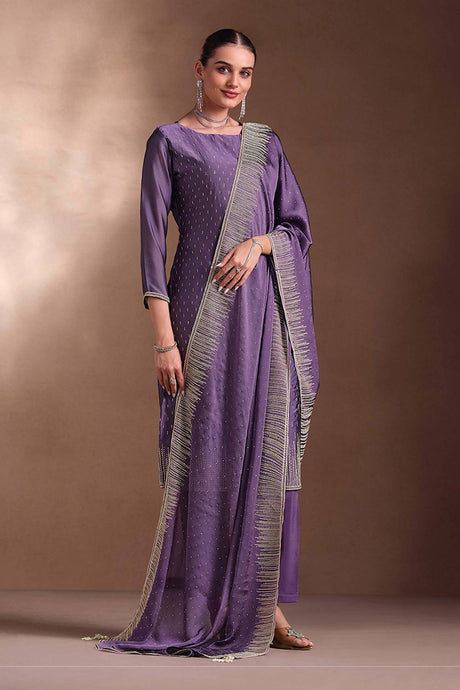 Violet Embroidered Silk Straight Cut Suit Set