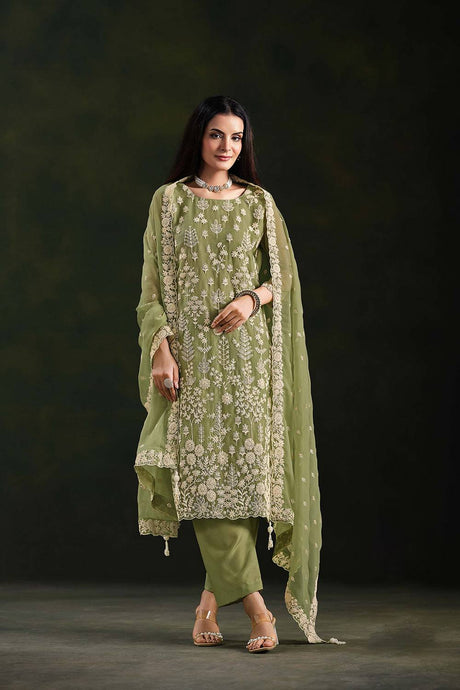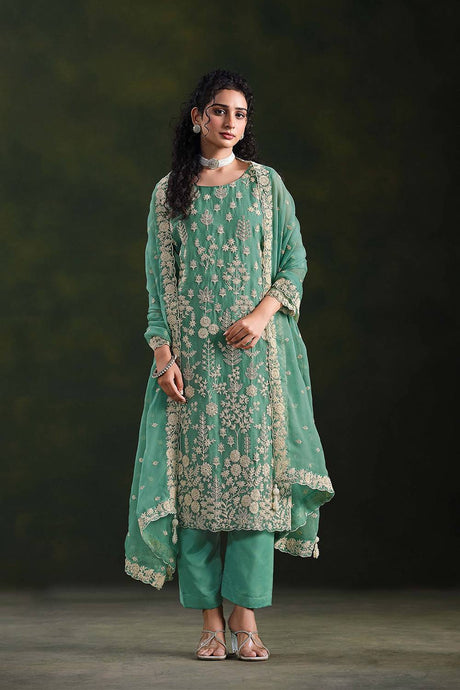 Pista Green Embroidered With Embellished Georgette Pant Suit Set