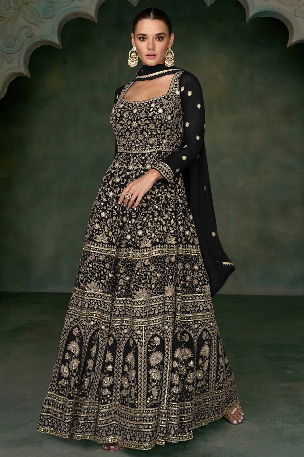 Black Sequin with Floral Embroidered Georgette Gown