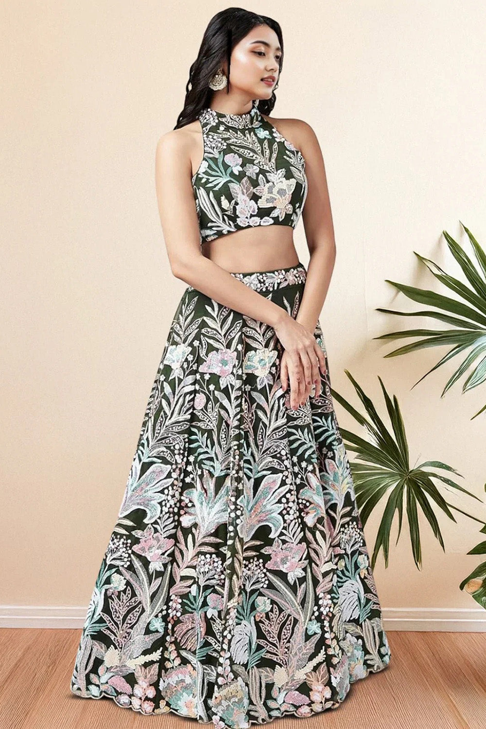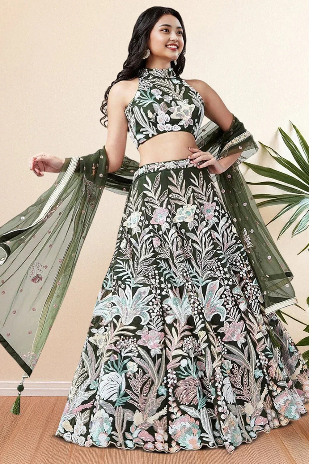 Green Floral Embroidered Net Lehenga