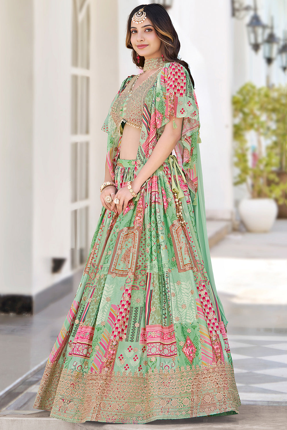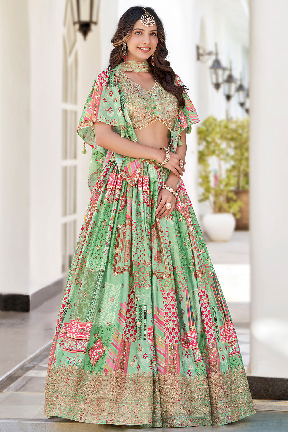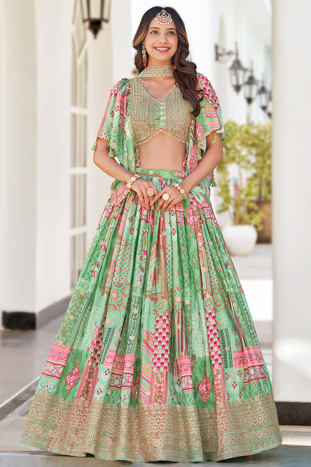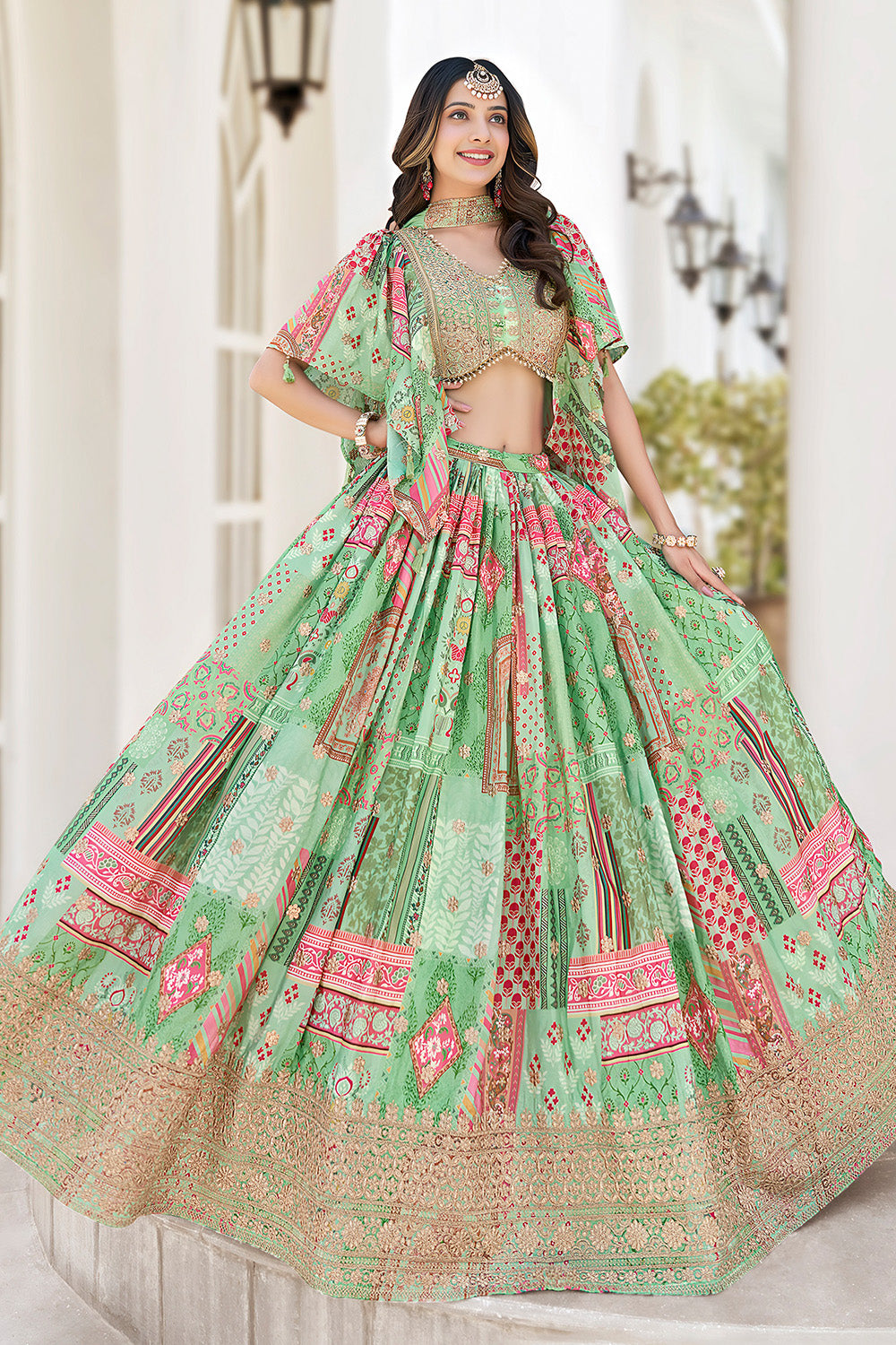 Step into the spotlight with our Lehenga a dazzling creation designed to make your special moments unforgettable. Crafted from premium Chinon Silk this lehenga offers a perfect combination of elegance and ease, keeping you graceful all day long. The exquisite Printed with Sequin makes this lehenga a masterpiece of traditional craftsmanship. Whether it’s Wedding, Sangeet, Engagement, Reception or a grand celebration, this lehenga is the perfect choice to make a statement. Pair it with an ornate choker, a matching dupatta, and embellished stilettos to complete the regal look. Add a sleek bun or cascading curls for added glamour. Make every moment magical with the timeless allure of Lehenga