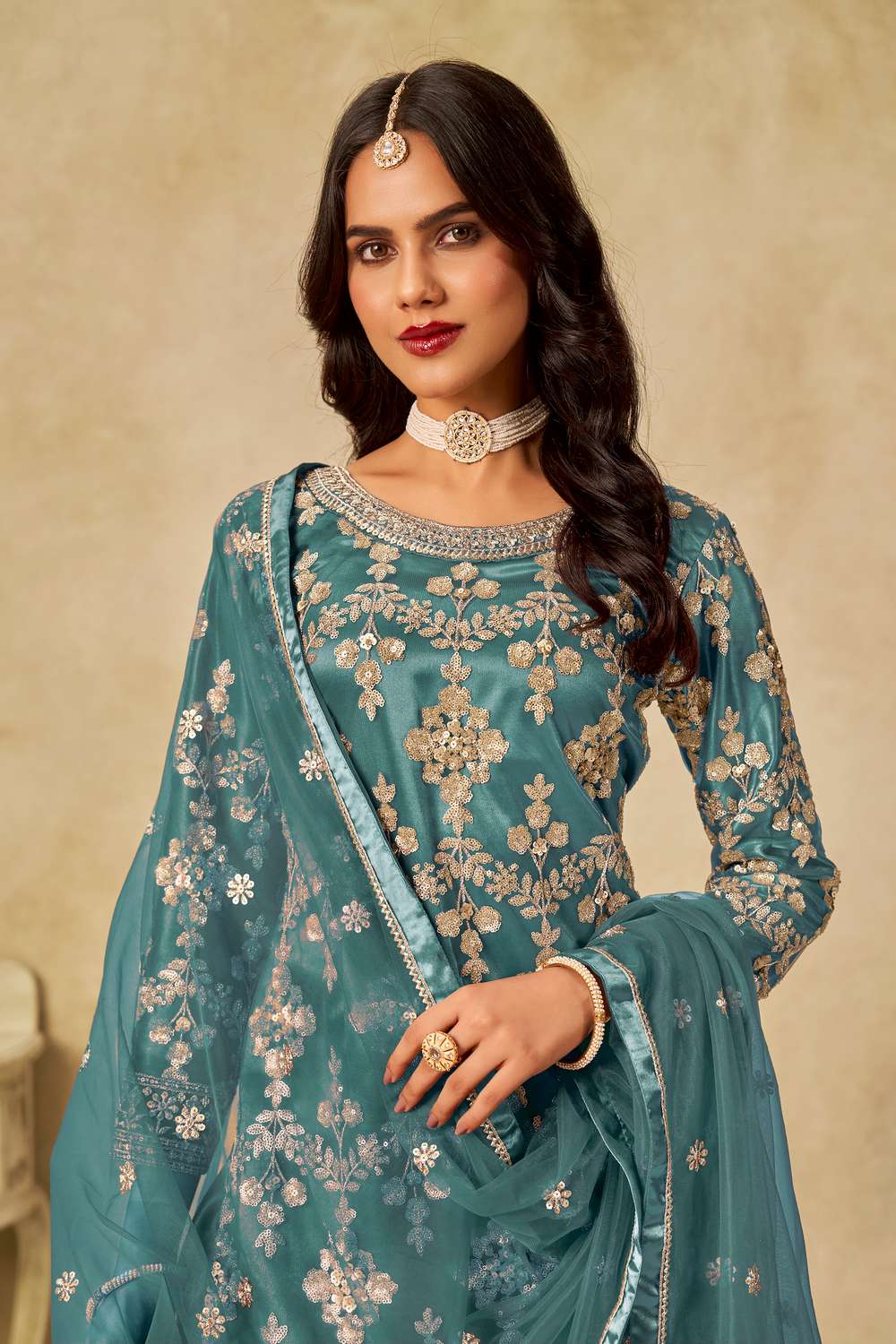 Sea Green Floral Sequin Net Palazzo Suit Set