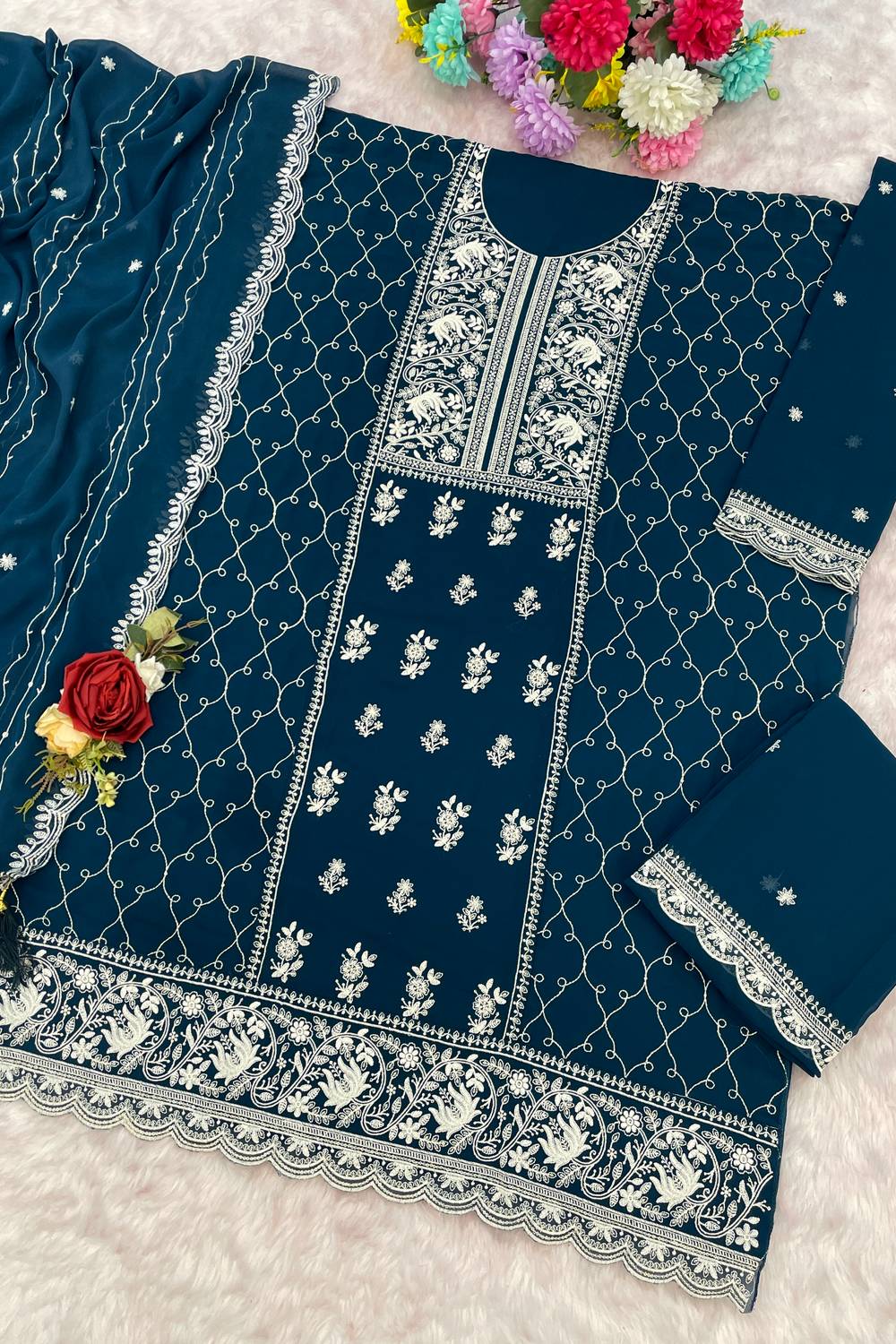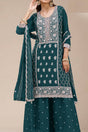 Turquoise Floral Embroidered Georgette Palazzo Suits