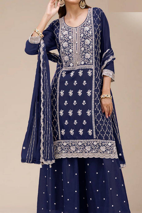 Blue Floral Embroidered Georgette Palazzo Suits