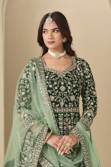 Green Floral Embroidered Velvet Gown