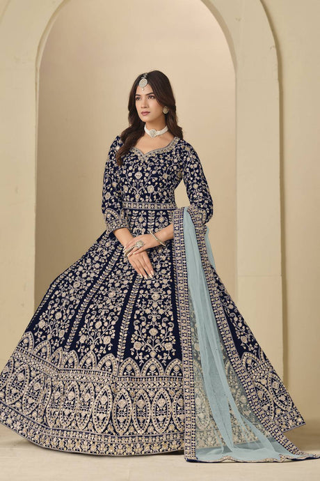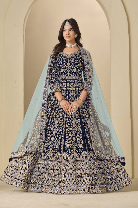 Blue Floral Embroidered Velvet Gown