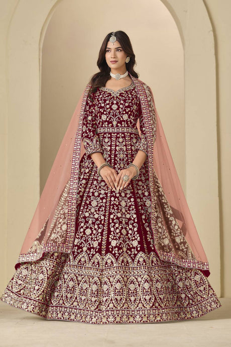 Maroon Floral Embroidered Velvet Gown