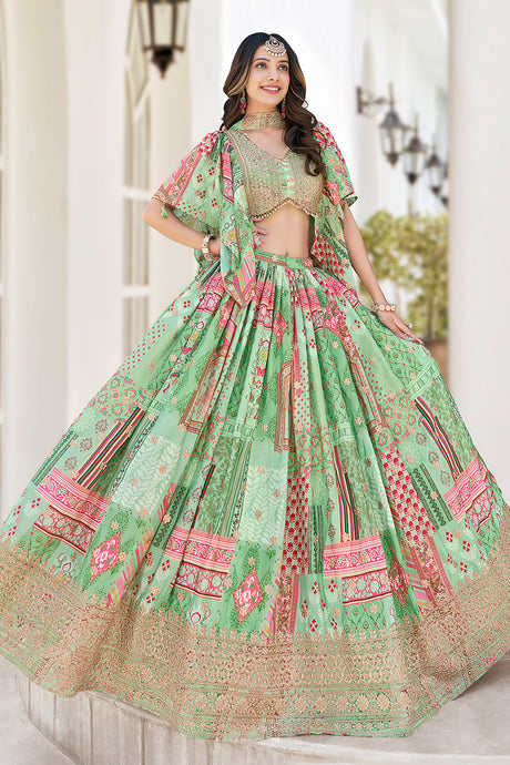 Green Printed with Sequin Chinon Silk Lehenga