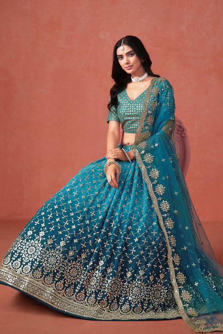 Turquoise Floral Sequin Georgette Lehenga