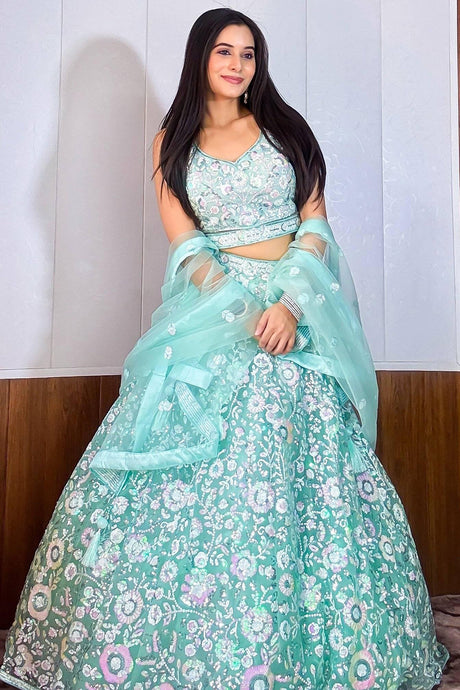 Green Floral Embroidered Organza Lehenga
