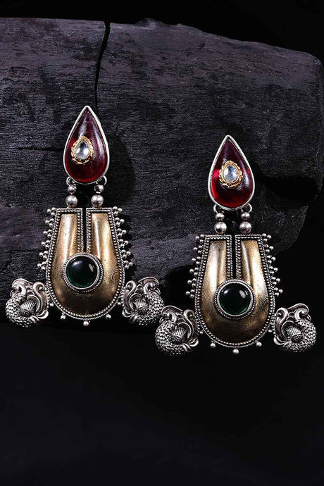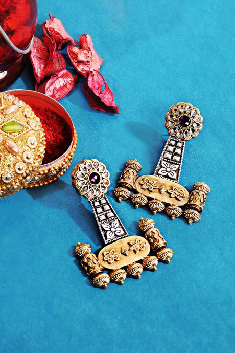 Grey And Orange Drop Earring With Kundan And Pearls