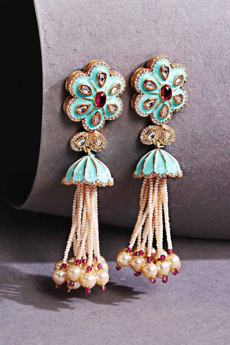 Blue And Yellow Drop Earring With Kundan And Pearls