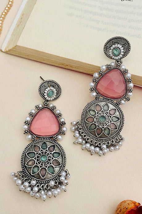 Green And Peach Drop Earring With Kundan And Pearls