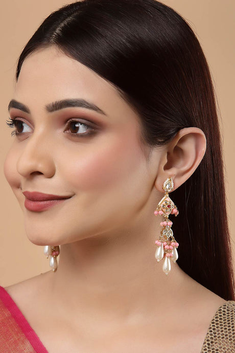 Pink And Cream Drop Earring With Kundan And Pearls