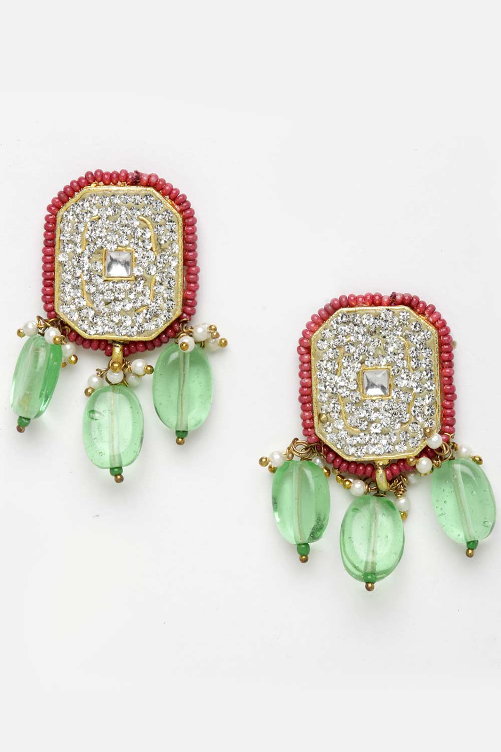 Green And Pink Gold-Plated Kundan And American Diamonds Drop Earrings